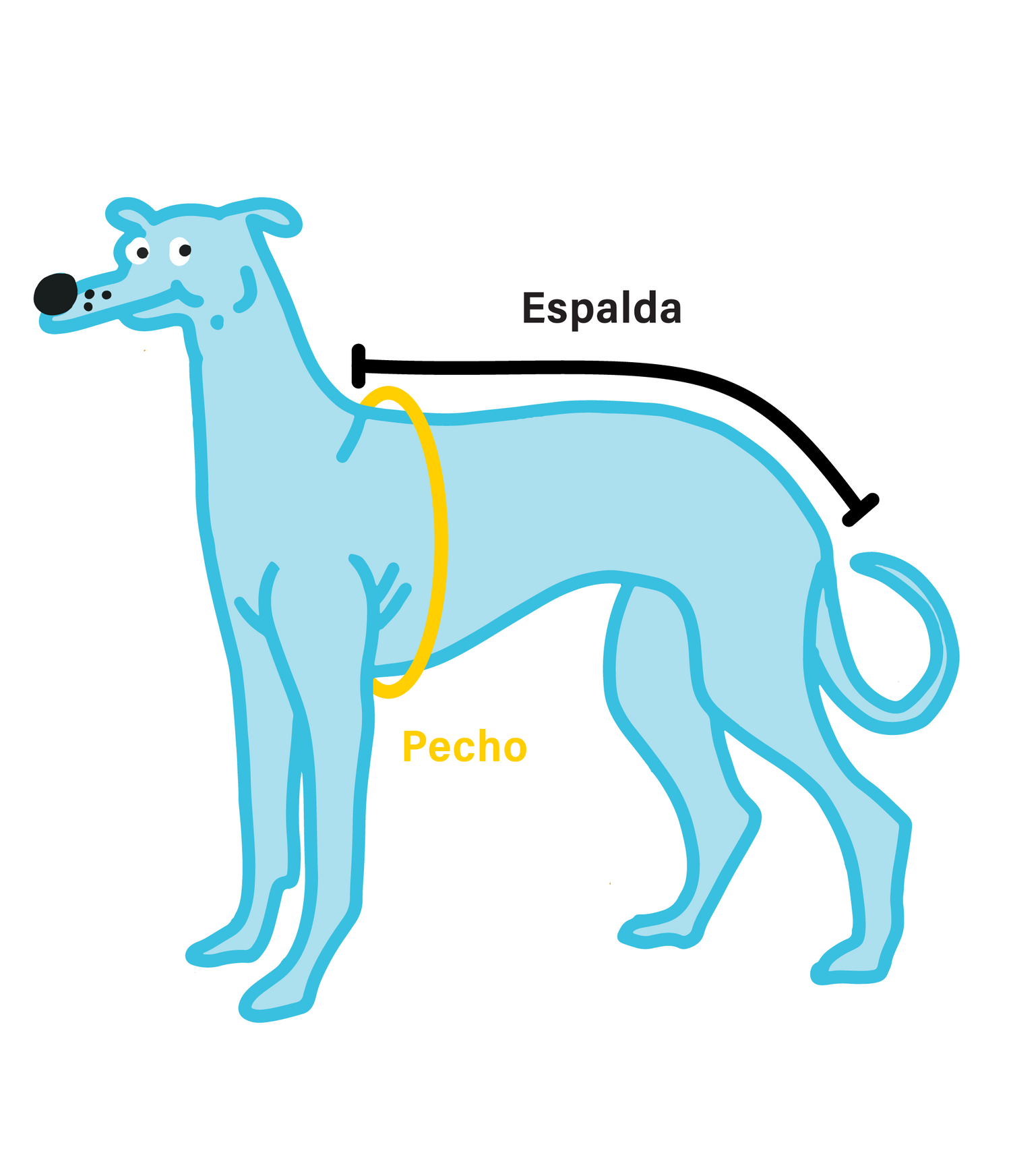 Para encontrar la talla perfecta para tu perro, te recomendamos medir el contorno del pecho (justo detrás de las patas delanteras) y el largo del lomo (desde la base del cuello, donde están los homóplatos, hasta el inicio de la cola).